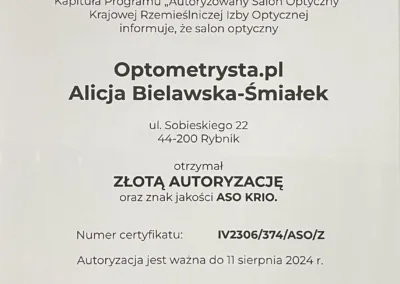Posiadamy Złoty Certyfikat Autoryzowanego Salonu Optycznego nadawanego przez KRIO. W 2019 roku podczas balu jubileuszowego z okazji 25 lecia Polskiego Towarzystwa Optometrii i Optyki zostaliśmy wyróżnieni, otrzymując statuetkę za dotychczasowe wieloletnie działania.
